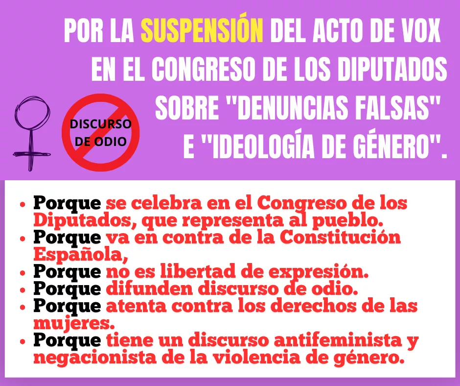 No al discurso de odio en la sociedad. No prestar el Congreso de los Diputados para conculcar nuestros derechos, que avala la Constitución Española. Hoy el Congreso de los Diputados, en la sala Ernest Lluch, es el escenario de las «Jornadas sobre ideología de género y denuncias falsas España/Argentina», los días 4 y 5 de septiembre, organizadas por Vox y la Asociación Nacional de Ayuda a las Víctimas de Violencia Doméstica (ANAVID). La Mesa de la Cámara Baja, es el órgano encargado de autorizar las peticiones de grupos parlamentarios, partidos políticos, asociaciones u organizaciones para utilizar las dependencias del Congreso con el fin de hacer actos. La Mesa dio el visto bueno, con el voto a favor del PP y PSOE, con el voto en contra de Sumar. Esquerra Republicana de Catalunya (ERC), EH Bildu y Bloque Nacionalista Galego (BNG) registraron un escrito ante la Mesa del Congreso para exigirle que no se celebrara. A pesar de todo ello, Vox puede acoger sus jornadas en el Congreso de los Diputados.